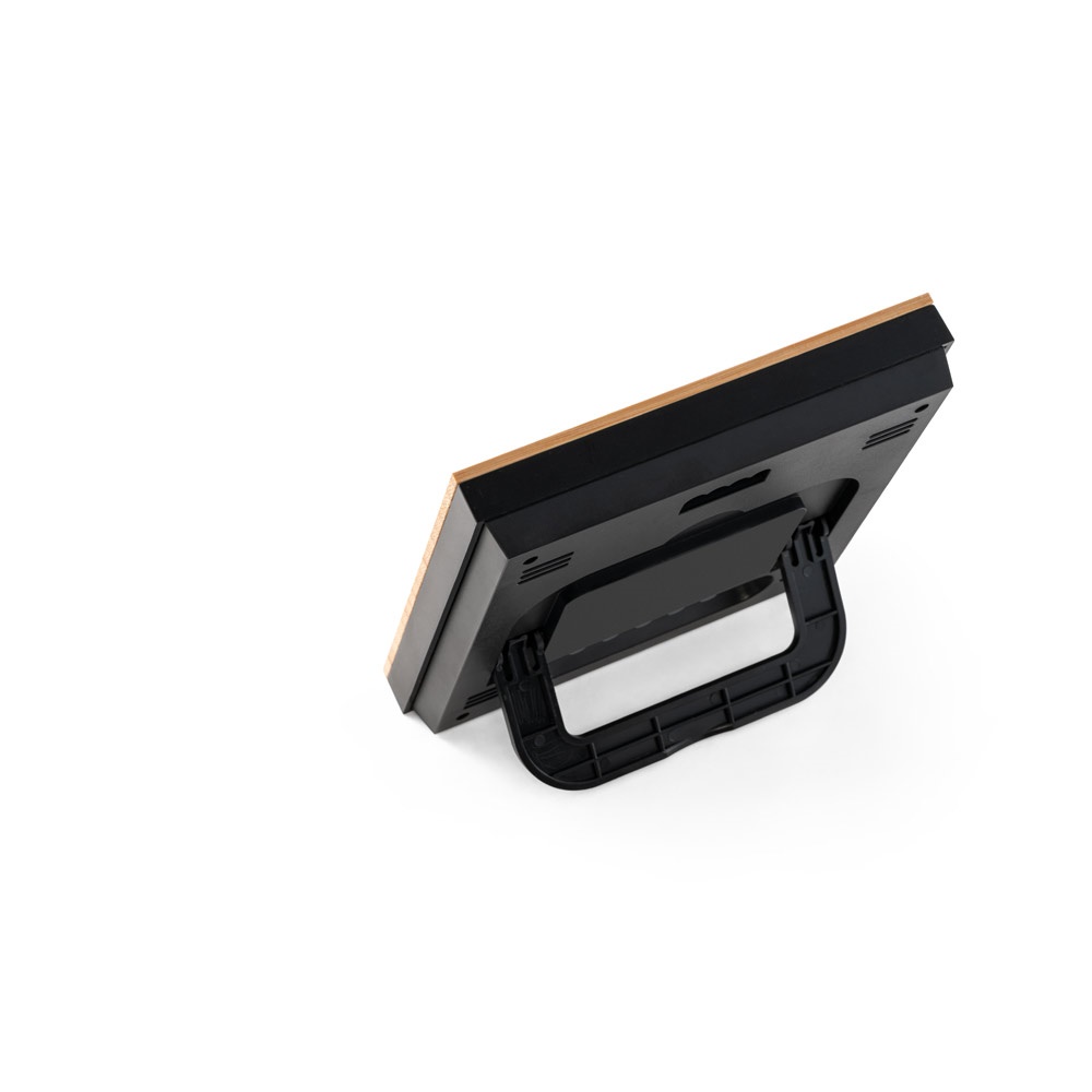 Estação meteorológica de secretária com ecrã LCD em ABS e bambu. Inclui as funções de relógio, alarme, calendário, termómetro e medição de humidade. Funciona com 2 pilhas AAA (não incluídas). Fornecido em caixa de oferta em papel kraft. Por ser um produto composto por materiais naturais, a cor do produto e o resultado da impressão podem variar entre produtos. 130 x 130 x 21 mm