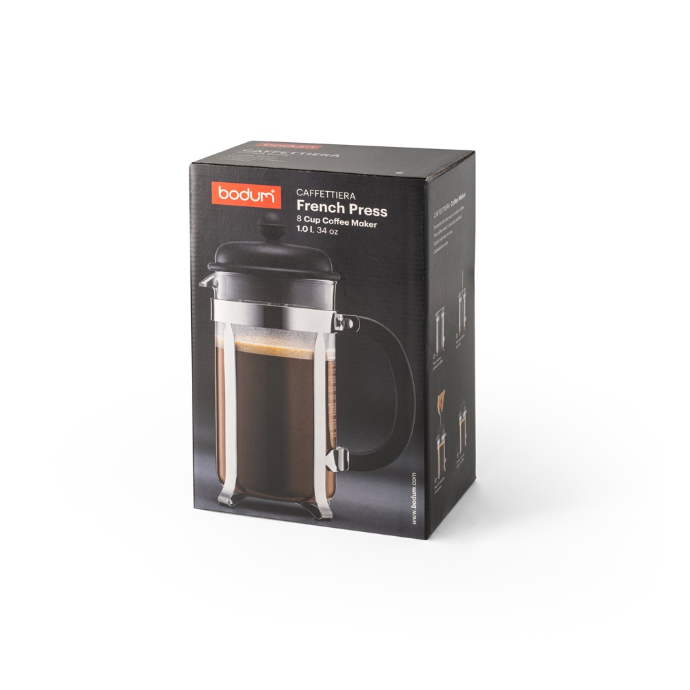 Cafeteira de prensa francesa com recipiente em vidro de borossilicato de alta qualidade. O vidro é resistente ao calor e não altera o sabor natural do café. Possui êmbolo e filtro reutilizável, de aço inoxidável, que extrai todos os óleos dos grãos de café para deixar o mínimo de sedimentos na chávena. A estrutura, em aço inoxidável cromado, protege o jarro de vidro enquanto a tampa de plástico e a pega permitem uma utilização segura e conveniente. A Caffettiera combina a facilidade e a rapidez na preparação com a pureza do sabor duma cafeteira de prensa. Tem capacidade até 1 L. Fornecido em caixa de oferta. 171 x 242 x 106 mm