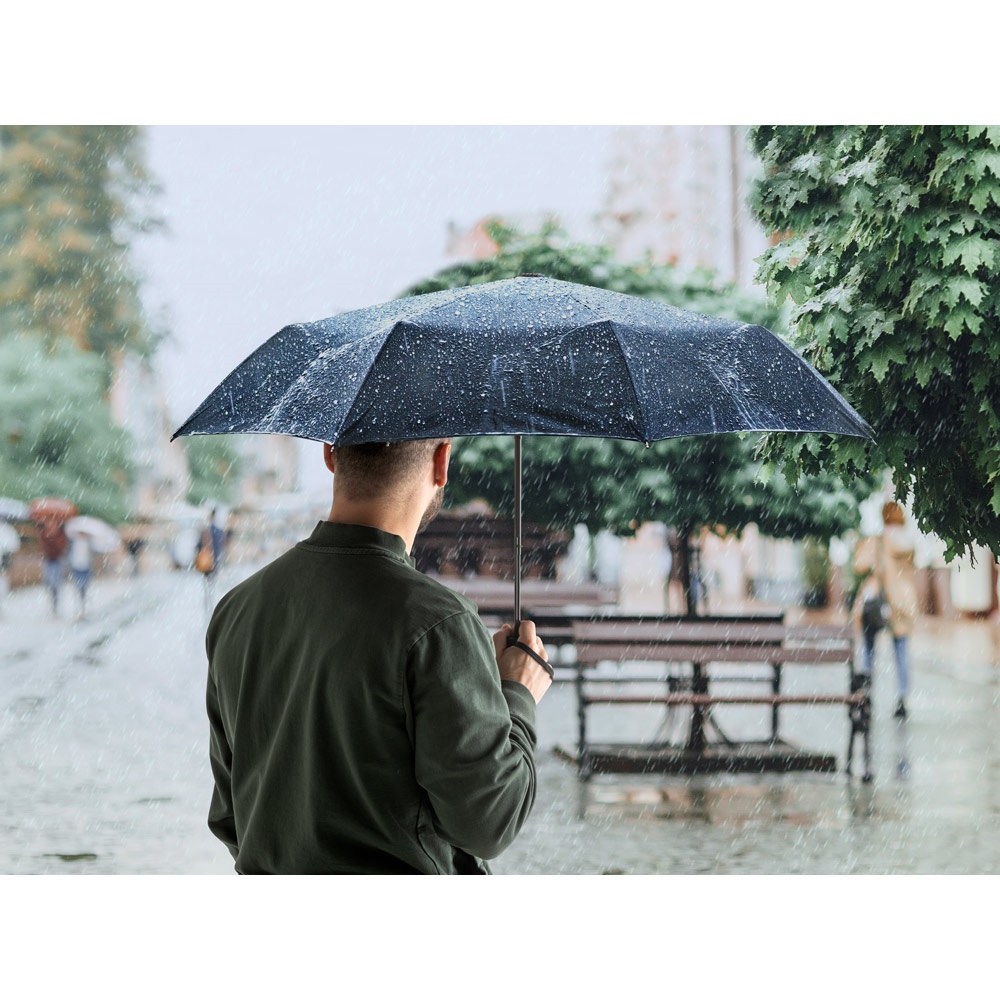 Guarda-chuva em poliéster reciclado (100% rPET) 190T pongee, com varetas em fibra de vidro e pega em PP. Guarda-chuva dobrável em 3 secções com abertura automática e à prova de vento. Fornecido em bolsa. Guarda-chuva: ø990 x 290 mm | Bolsa: ø55 x 240 mm