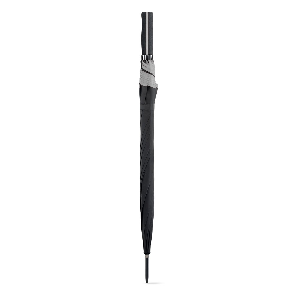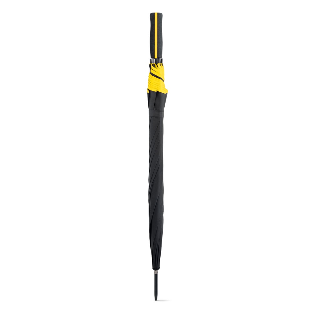 Guarda-chuva em poliéster 190T, com pega em EVA e mecanismo de abertura automática. Detalhe com linha colorida no chapéu e na pega. ø1040 x 825 mm
