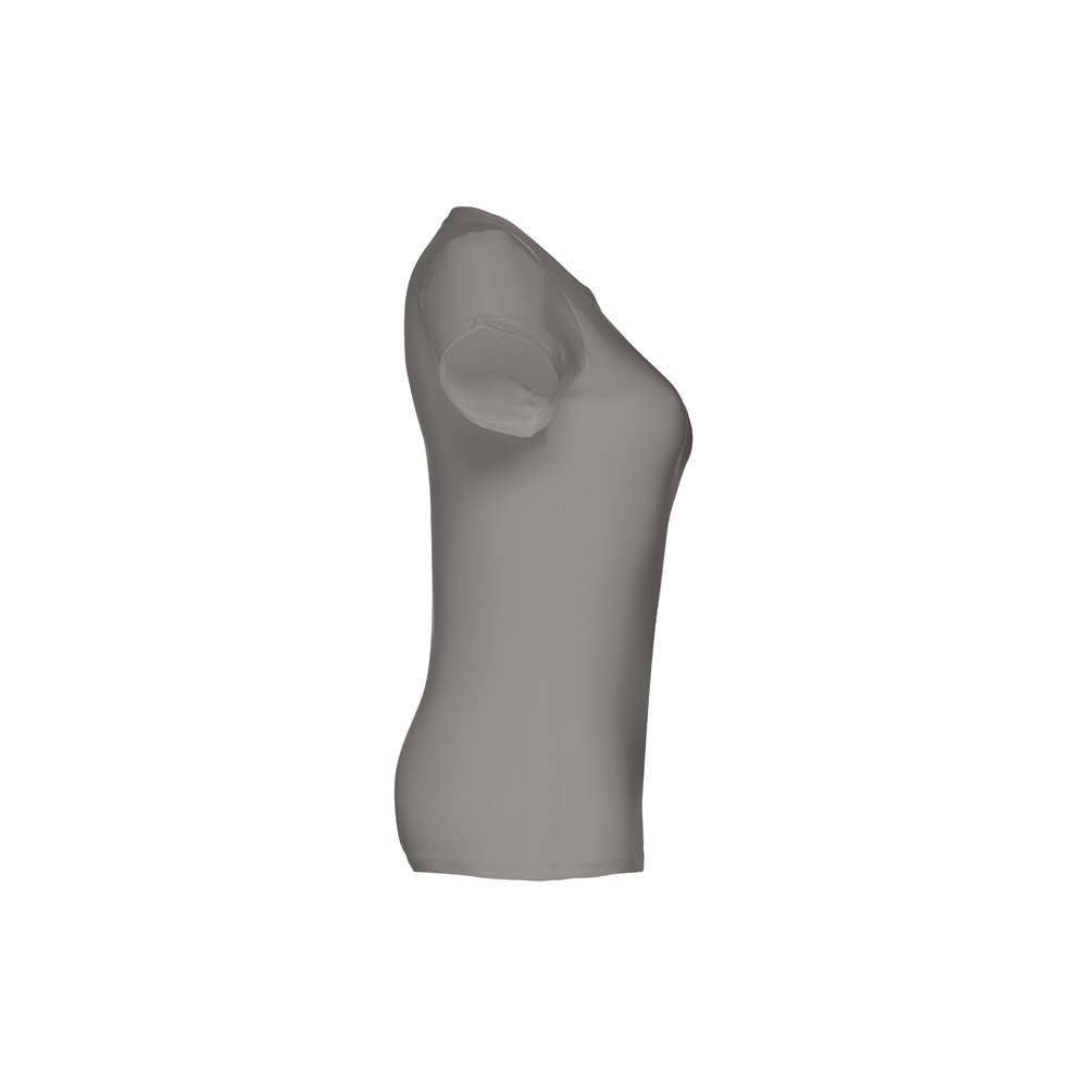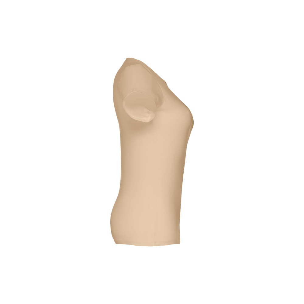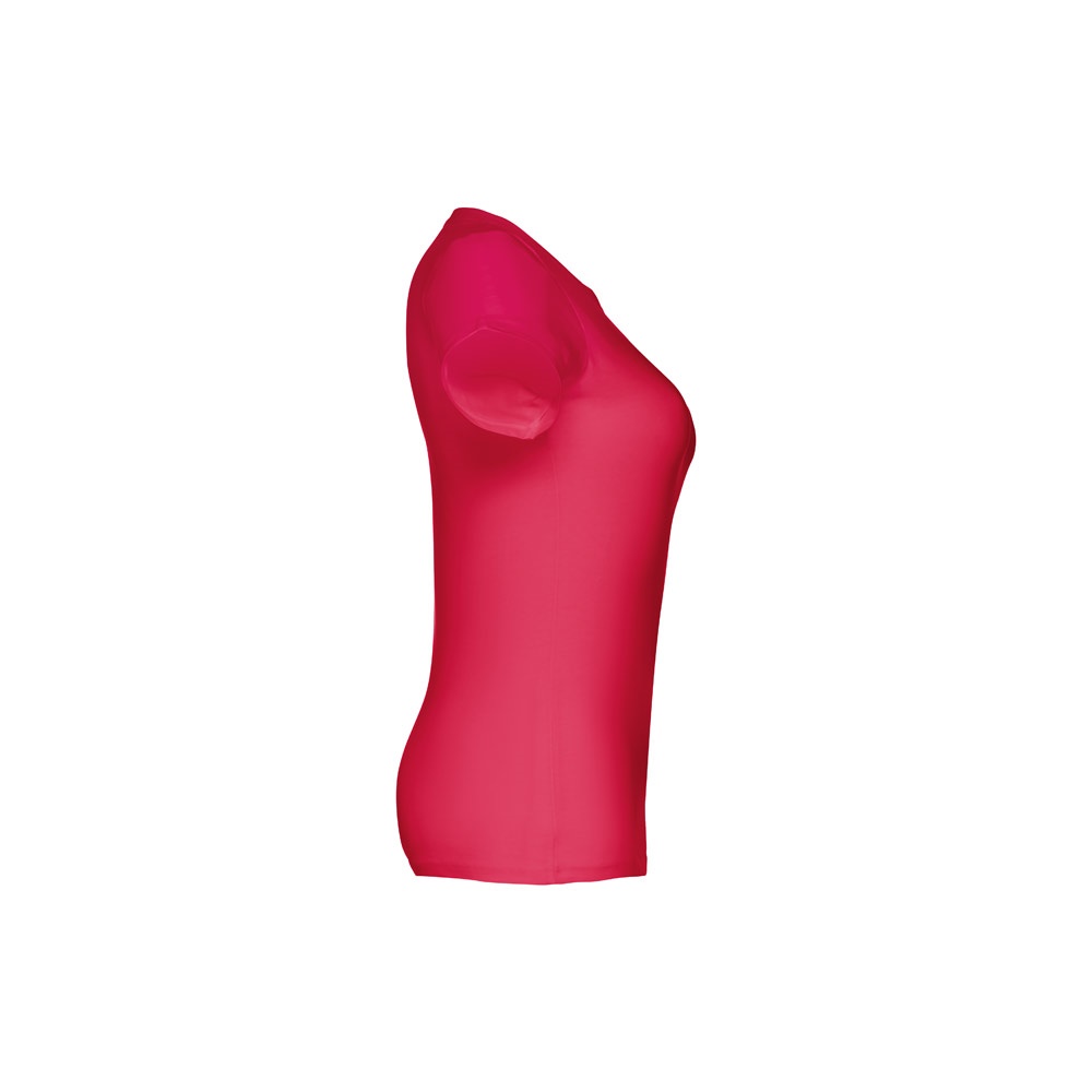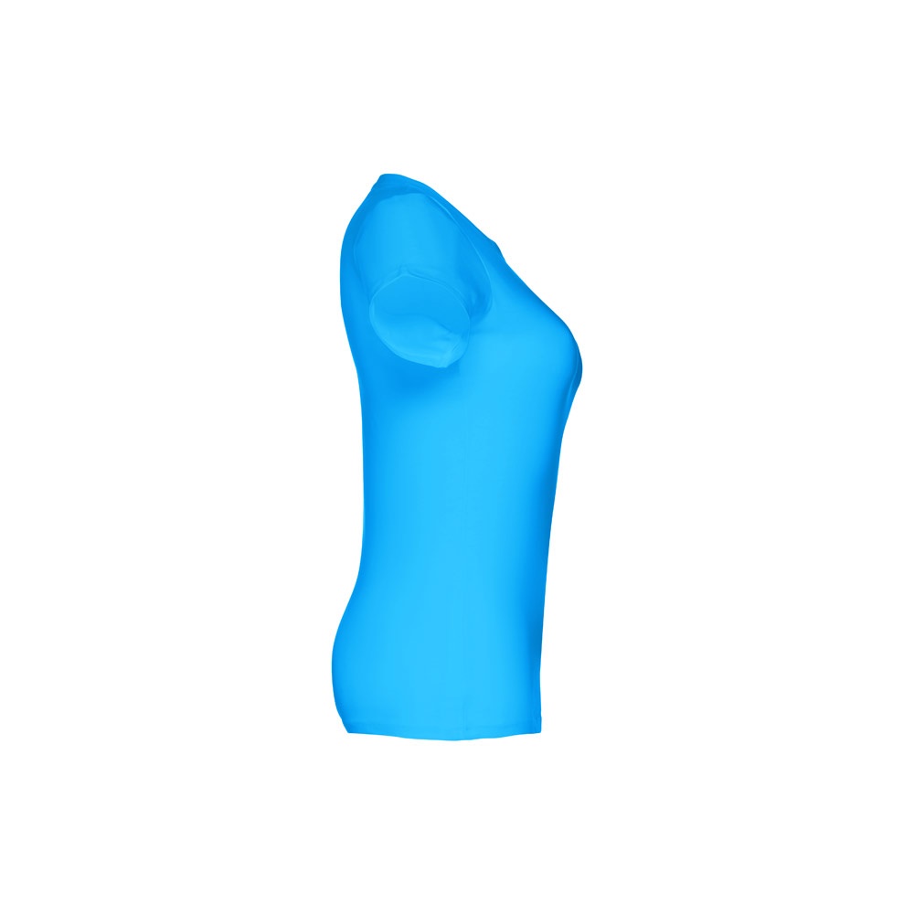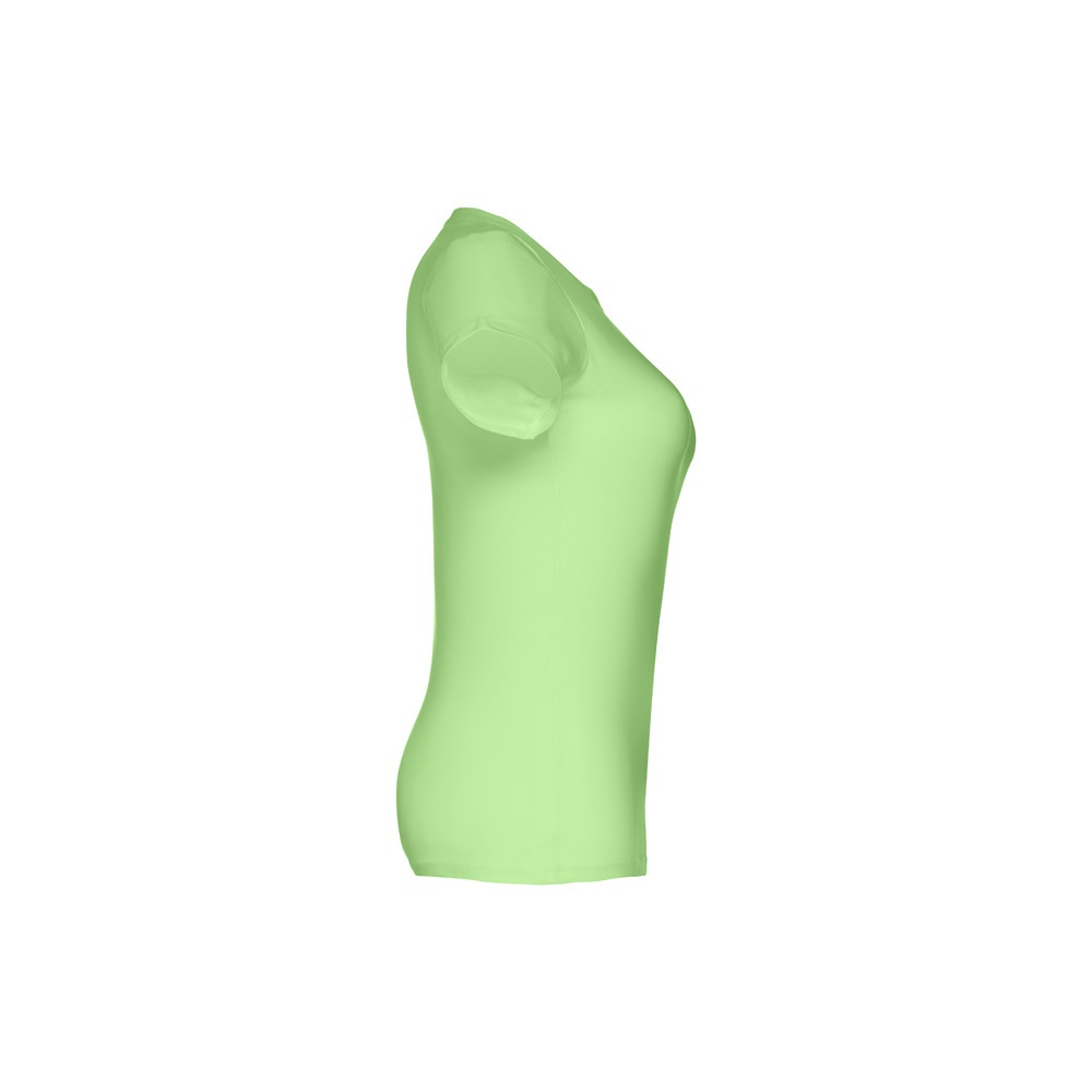 T-shirt cintada para senhora em malha jersey 100% algodão (190 g/m²) com fio de algodão cardado (cor 183: 90% algodão e 10% viscose). Contém gola fina em jersey com fita de reforço em cetim. Peça cortada e cosida com costura dupla nas mangas e parte inferior. Tamanhos: S, M, L, XL, XXL