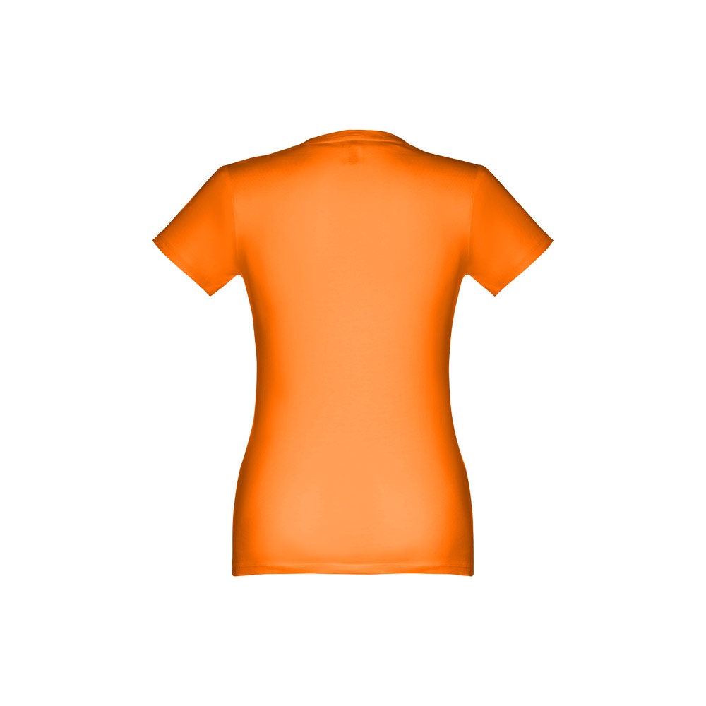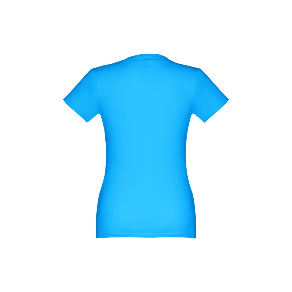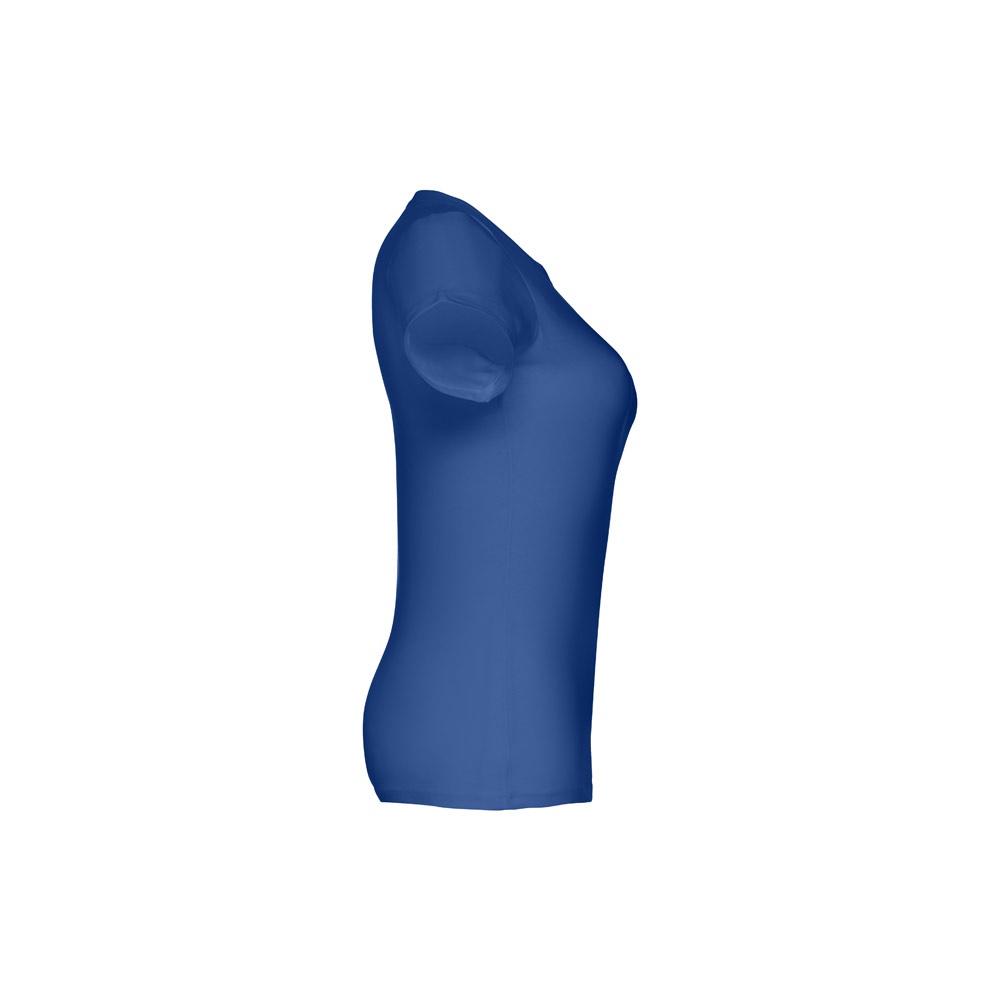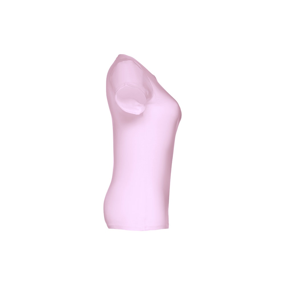 T-shirt cintada para senhora em malha jersey 100% algodão (190 g/m²) com fio de algodão cardado (cor 183: 90% algodão e 10% viscose). Contém gola fina em jersey com fita de reforço em cetim. Peça cortada e cosida com costura dupla nas mangas e parte inferior. Tamanhos: S, M, L, XL, XXL