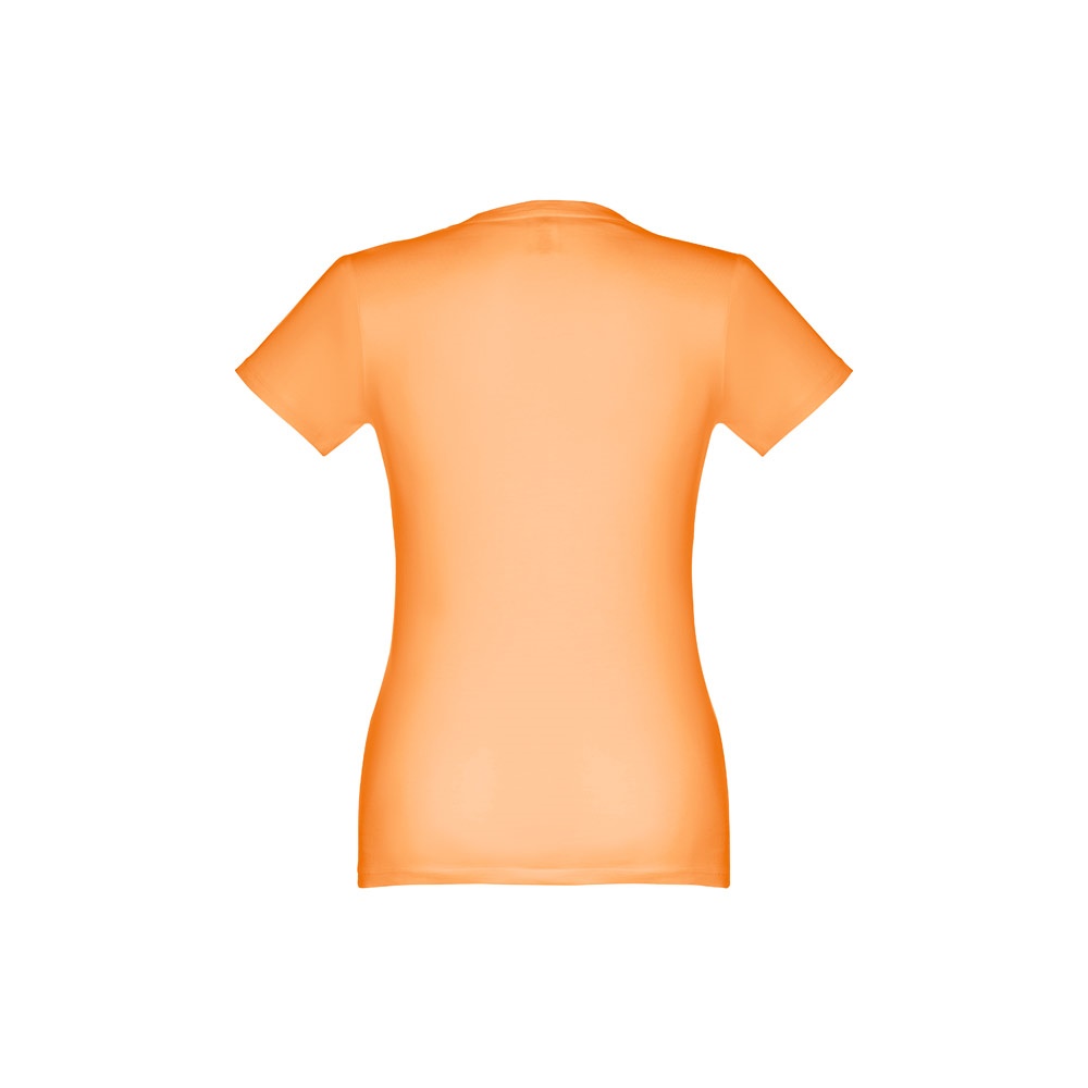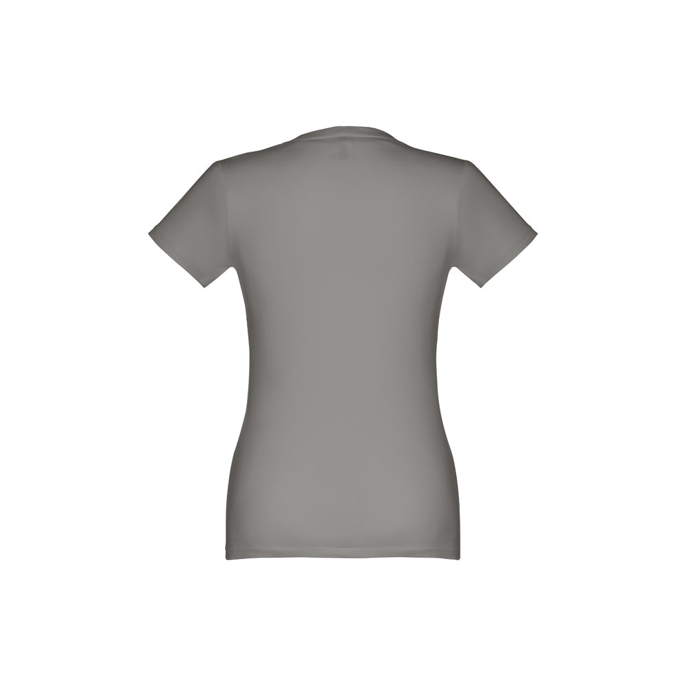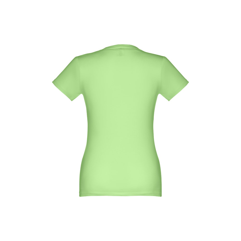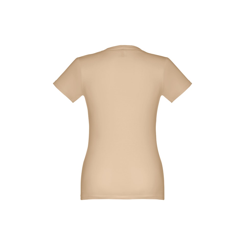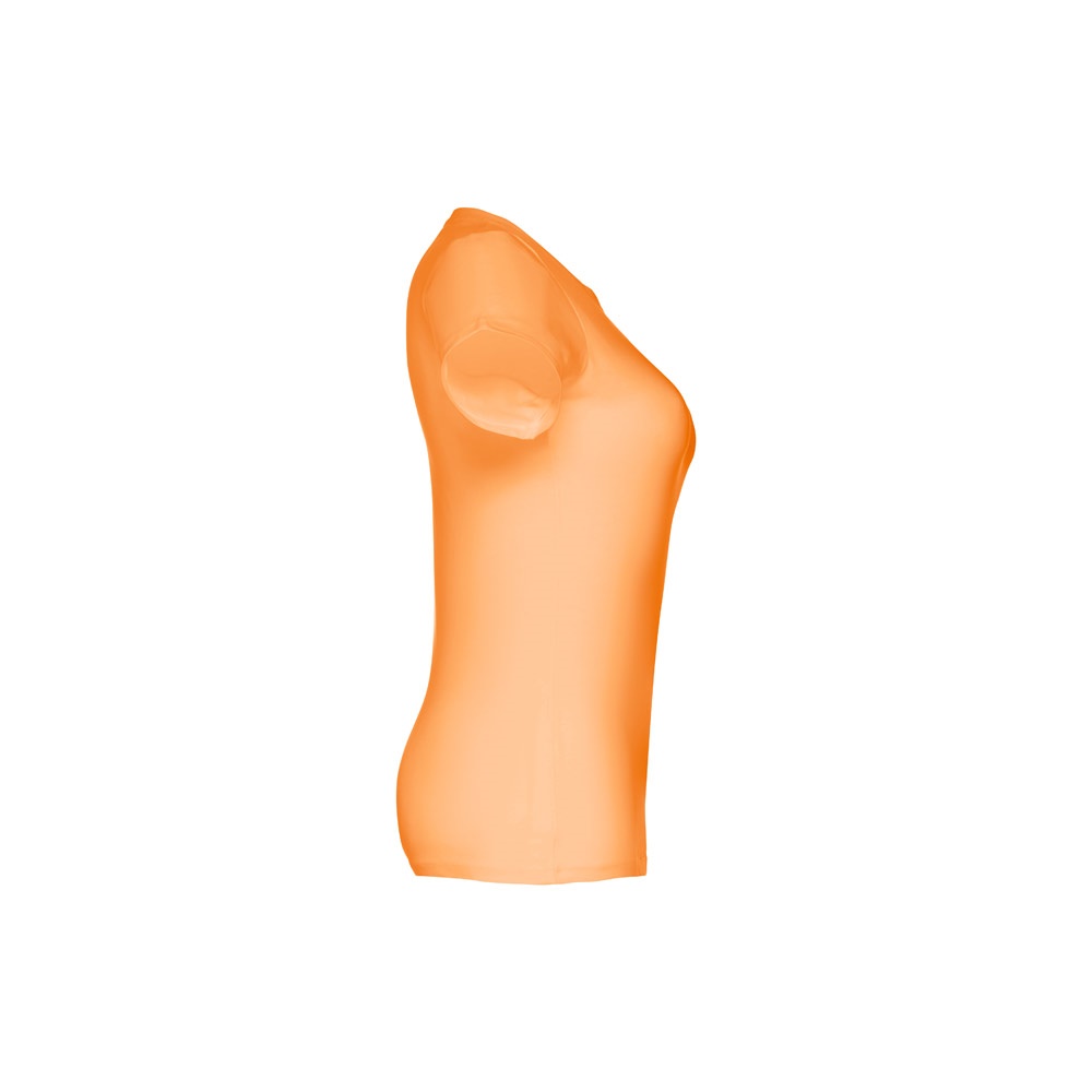 T-shirt cintada para senhora em malha jersey 100% algodão (190 g/m²) com fio de algodão cardado (cor 183: 90% algodão e 10% viscose). Contém gola fina em jersey com fita de reforço em cetim. Peça cortada e cosida com costura dupla nas mangas e parte inferior. Tamanhos: S, M, L, XL, XXL
