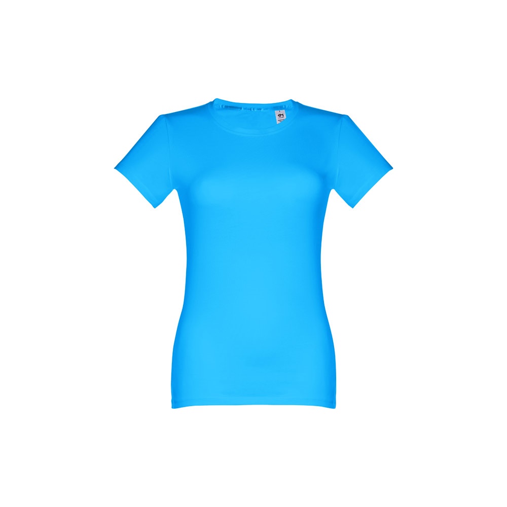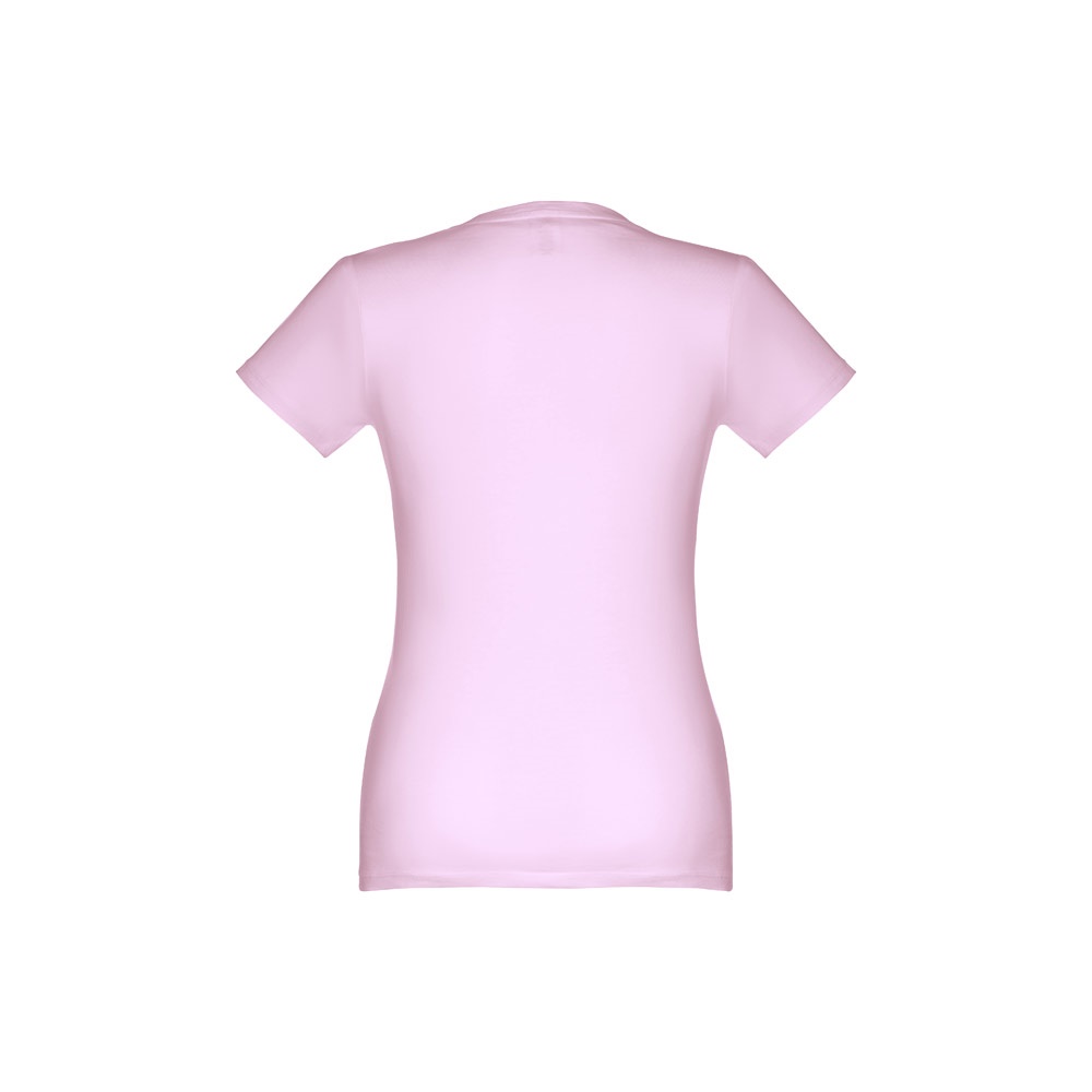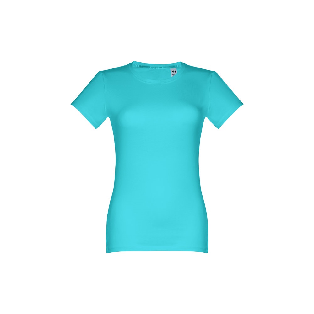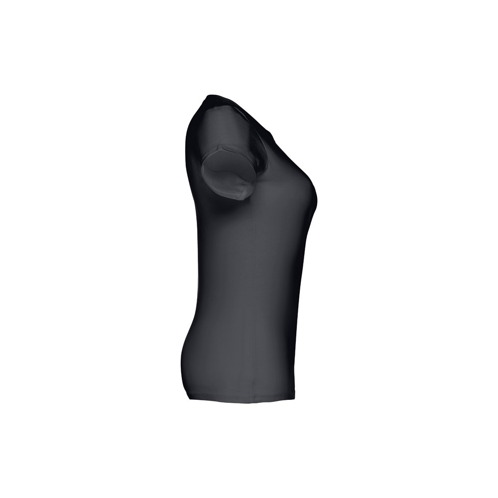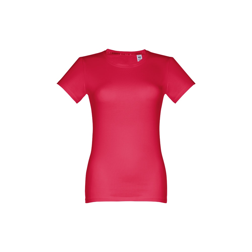 T-shirt cintada para senhora em malha jersey 100% algodão (190 g/m²) com fio de algodão cardado (cor 183: 90% algodão e 10% viscose). Contém gola fina em jersey com fita de reforço em cetim. Peça cortada e cosida com costura dupla nas mangas e parte inferior. Tamanhos: S, M, L, XL, XXL