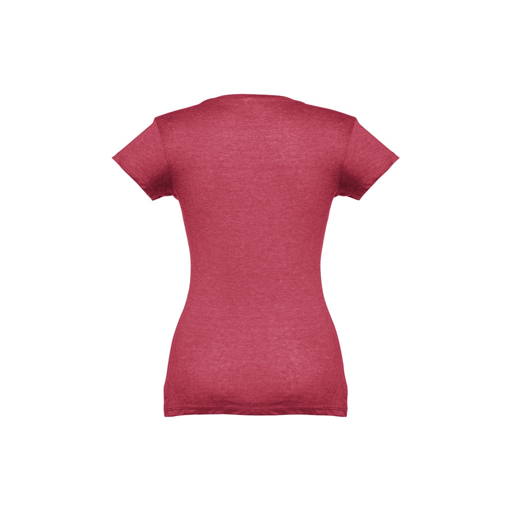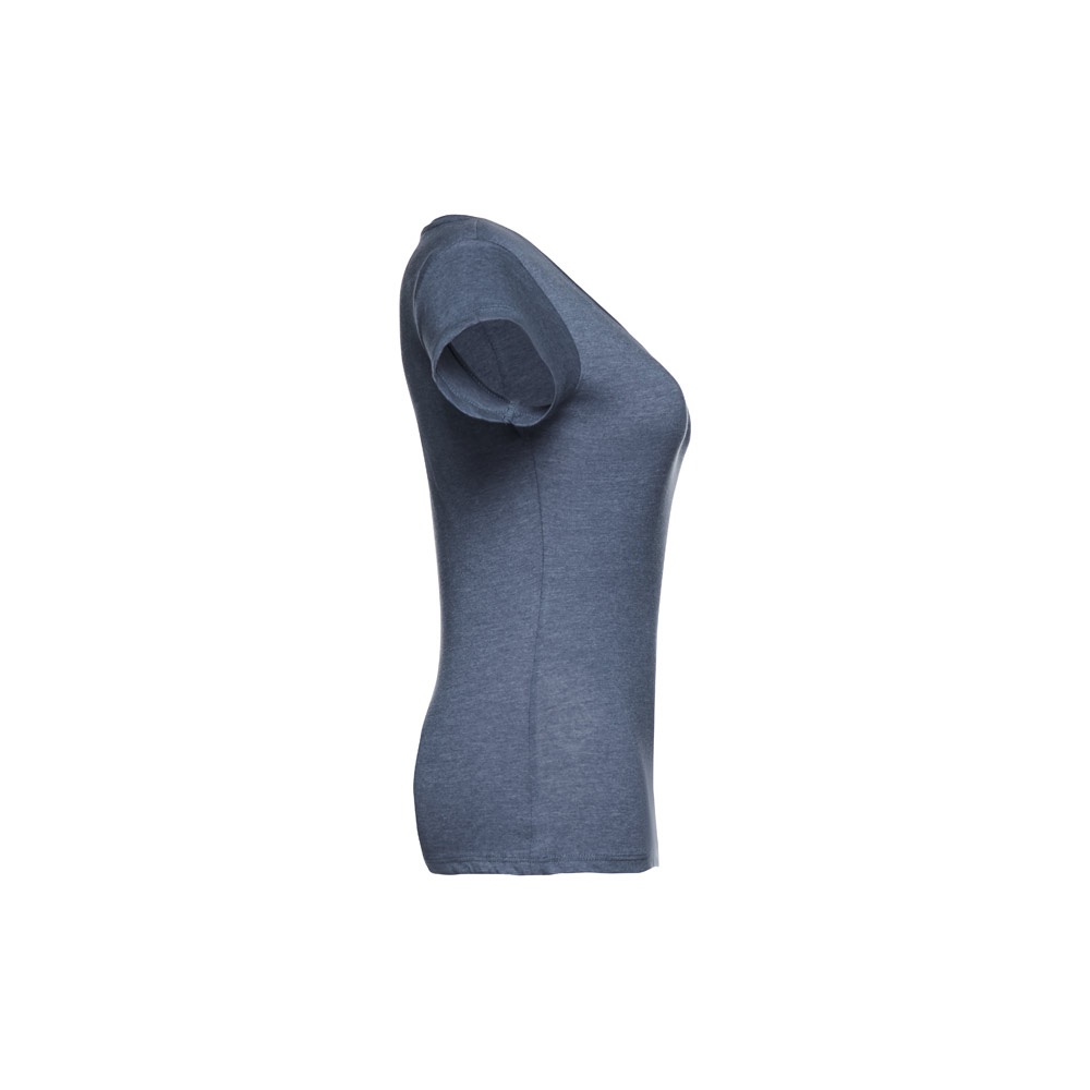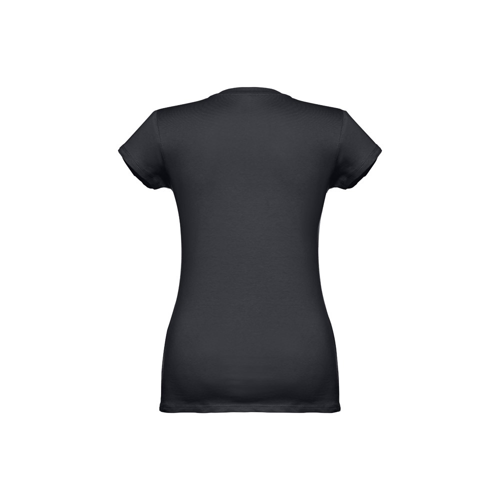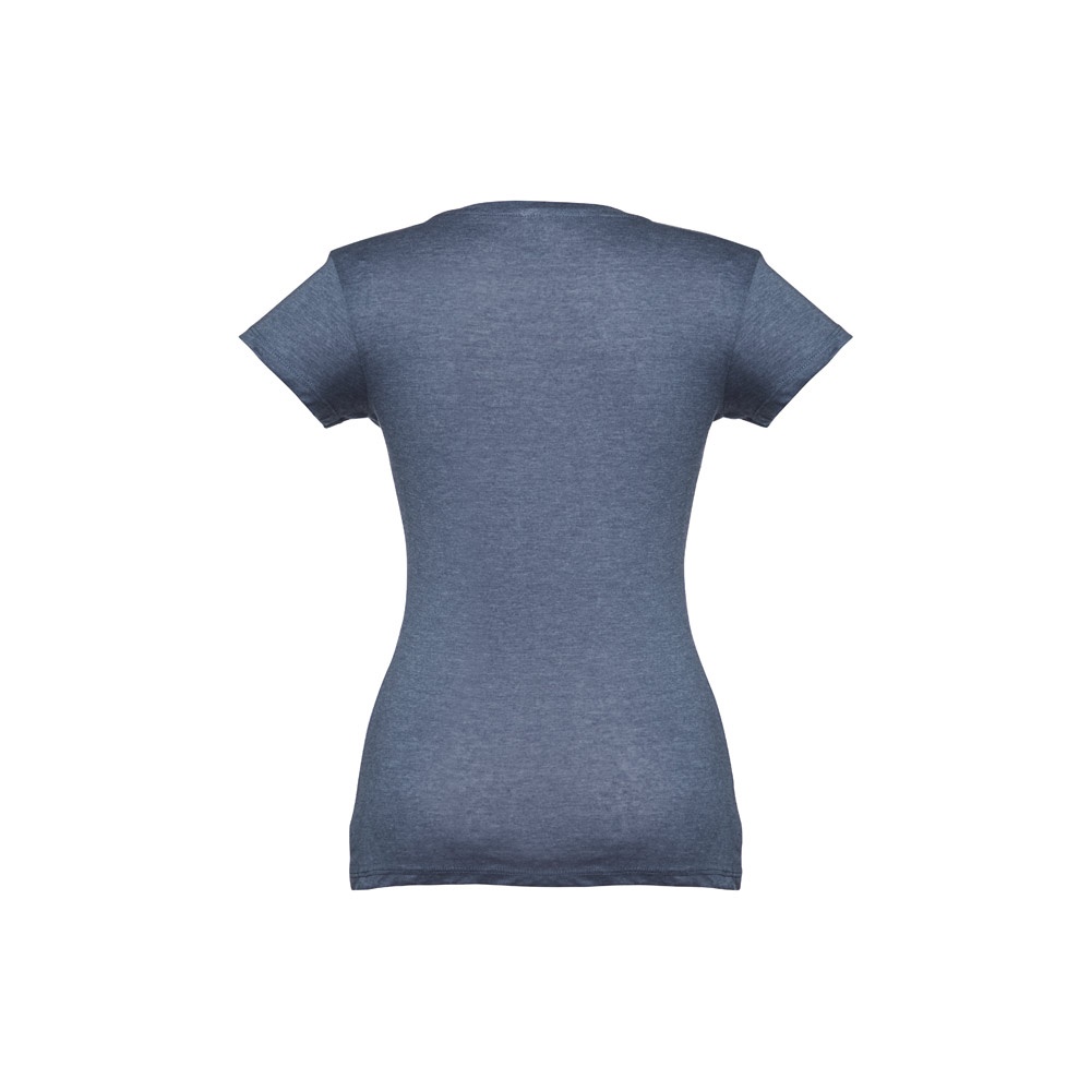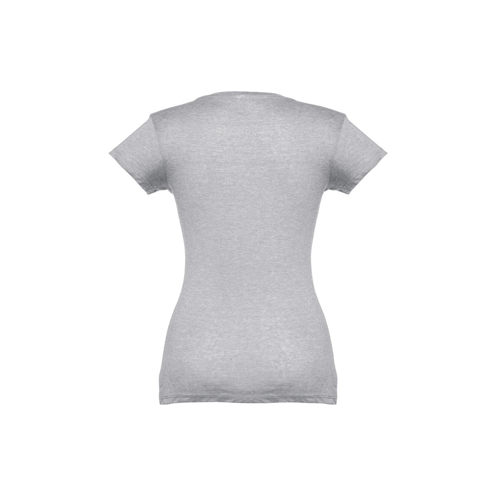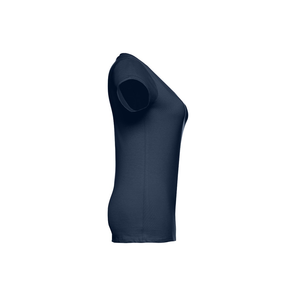 T-shirt cintada para senhora em malha jersey 100% algodão (150 g/m²) com fio de algodão cardado (cores: 194, 195 e 199: 60% algodão/40% poliéster). Contém gola em jersey com decote em “V” sobreposto, reforçada no interior com fita em jersey. Peça cortada e cosida com costura dupla nas mangas e parte inferior. Tamanhos: S, M, L, XL, XXL