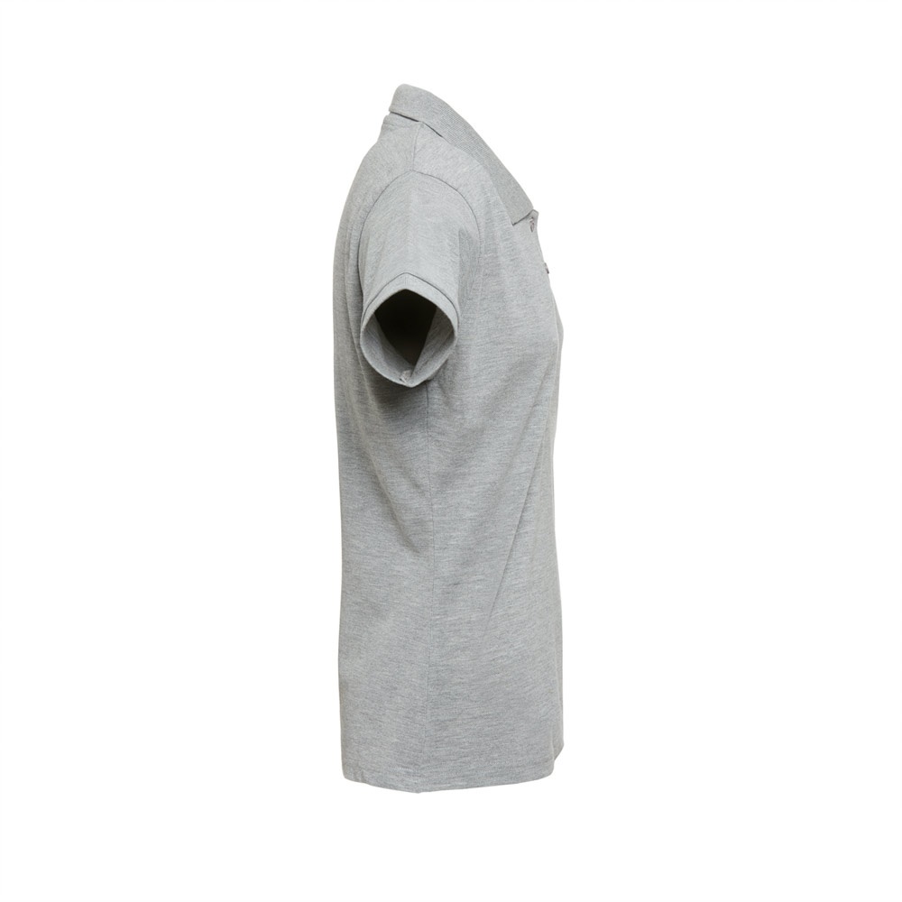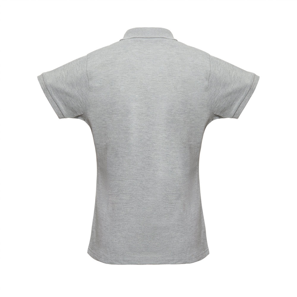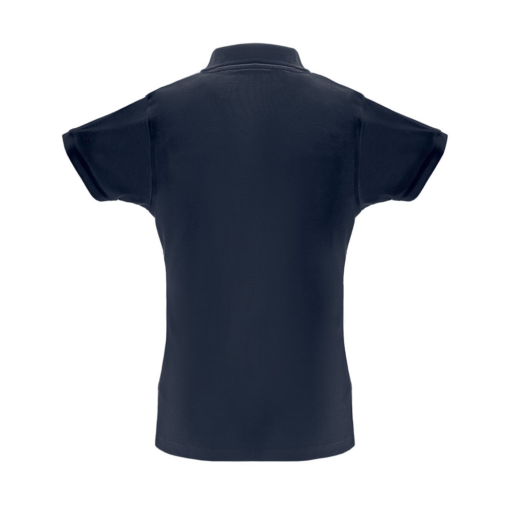 Polo de manga curta para mulher em malha piqué, 35% algodão cardado e 65% polié,ster (200 g/m²) (cor: 183: 85% algodão/15% viscose). Polo de corte cintado com gola e mangas em Rib, sendo a gola reforçada com fita em malha piqué,. Conté,m carcela reforçada com 3 botões à cor (botão suplente inserido na costura interior). Peça cortada e cosida. Tamanhos: S, M, L, XL, XXL