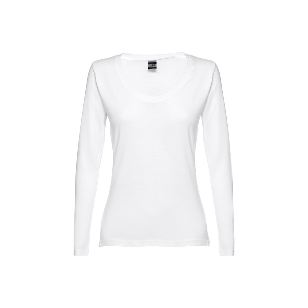 T-shirt cintada de manga comprida para senhora em malha jersey 100% algodão (150 g/m²) com fio de algodão cardado. De corte moderno com gola com fita de reforço em jersey. Peça cortada e cosida com costura dupla nas mangas e parte inferior. Tamanhos: S, M, L, XL, XXL