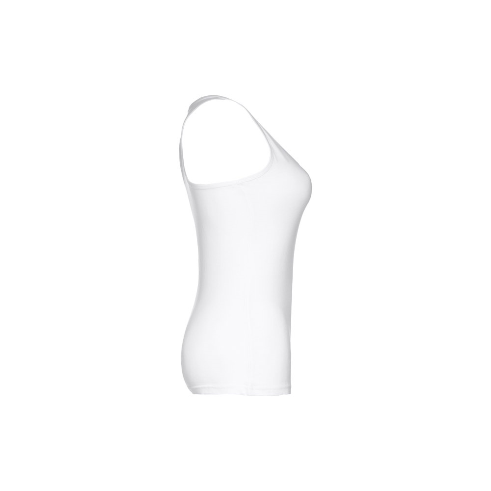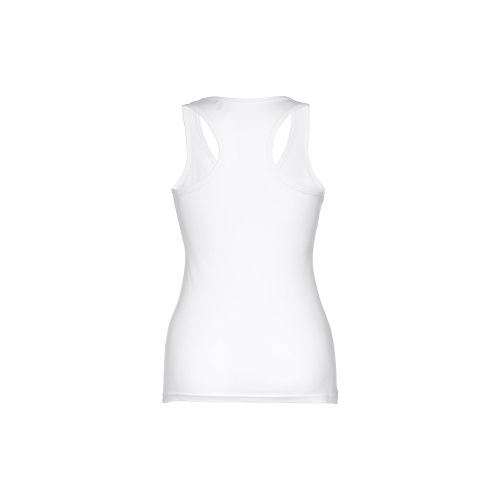 T-shirt sem mangas para senhora em malha jersey 100% algodão (160 g/m²) com fio de algodão cardado. Com costas em “T” e gola redonda. Peça cortada e cosida com costura dupla na parte inferior e acabamentos com debrum nas cavas e decote. Tamanhos: S, M, L, XL, XXL