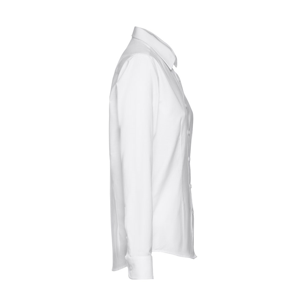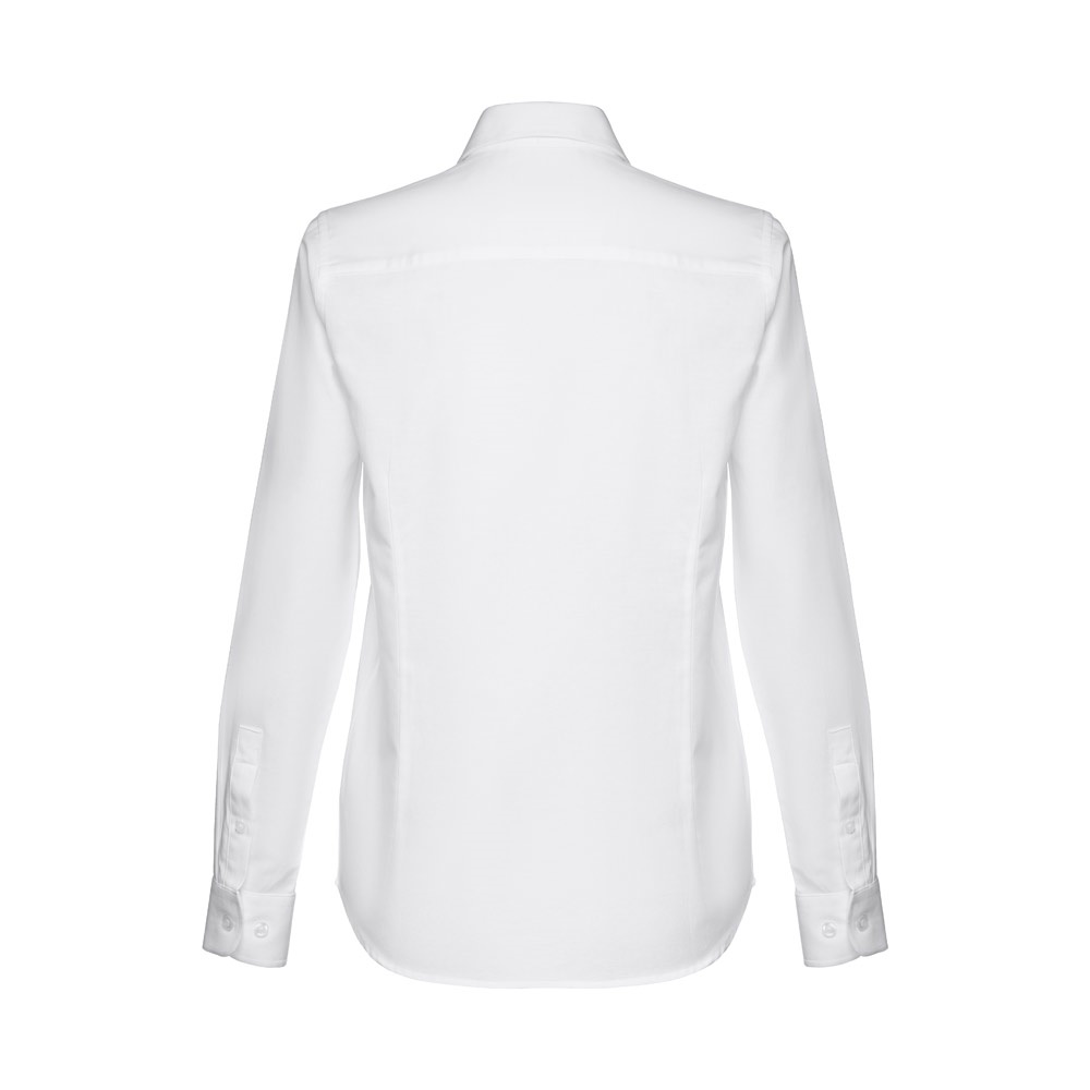 Camisa oxford de manga comprida para senhora em 70% algodão e 30% poliéster (130 g/m²). Contém punhos ajustáveis com 2 botões e manga com 1 prega. Camisa cintada com duas pinças na zona da frente e das costas e carcela com 7 botões de cor pérola. Tamanhos: S, M, L, XL, XXL
