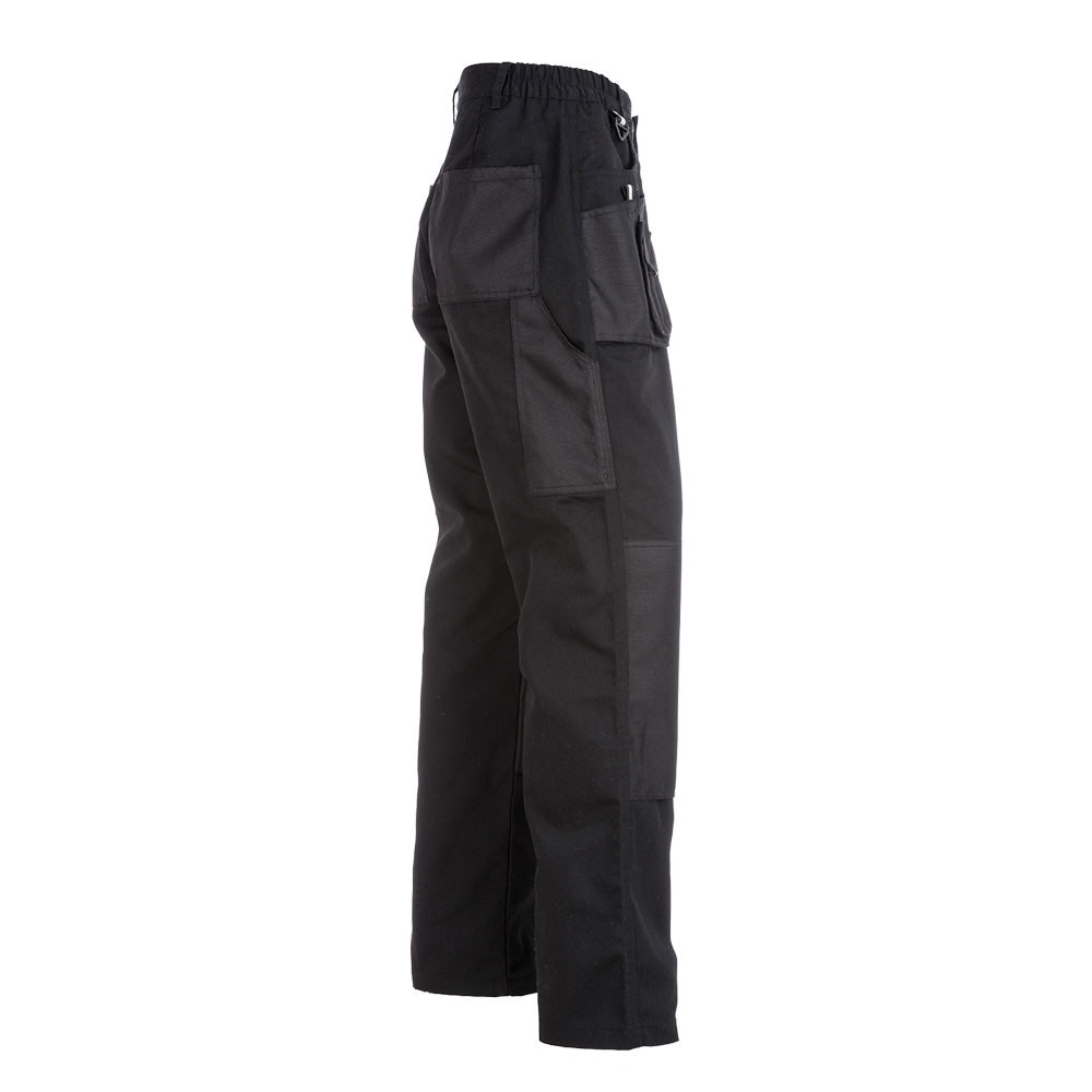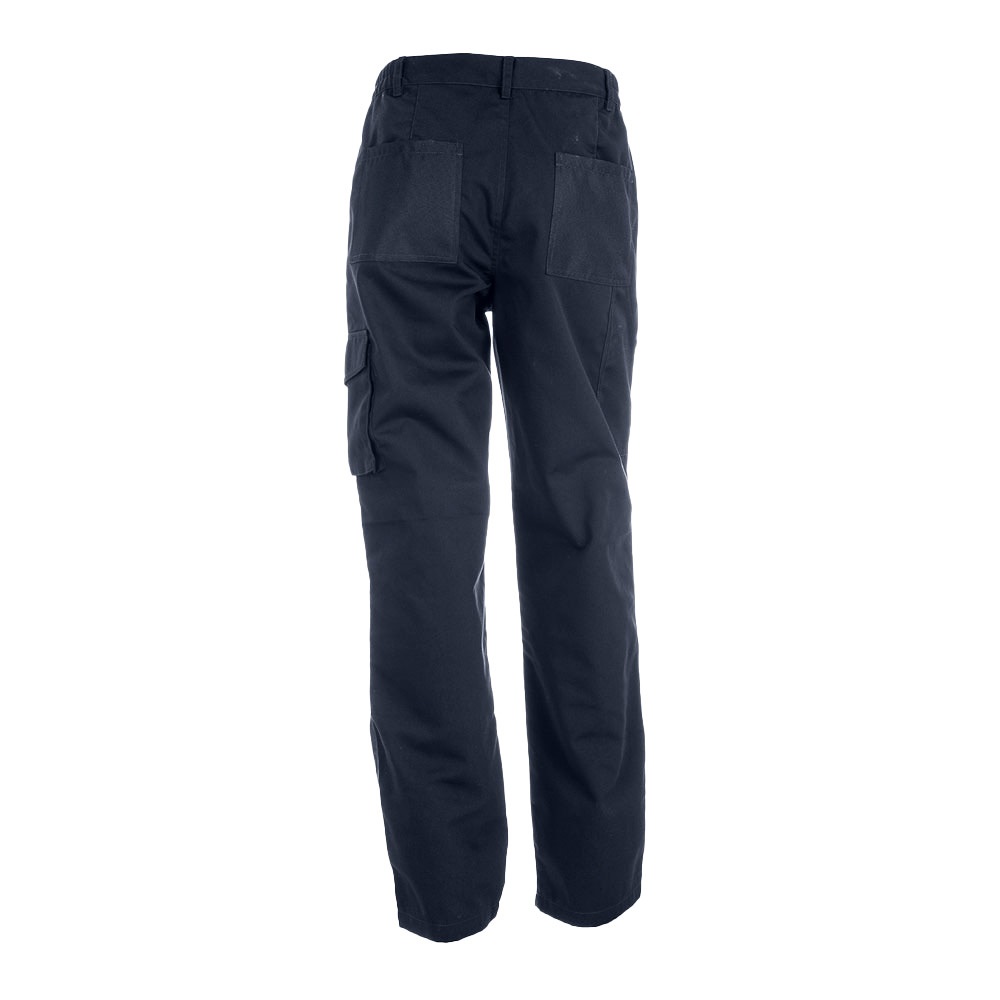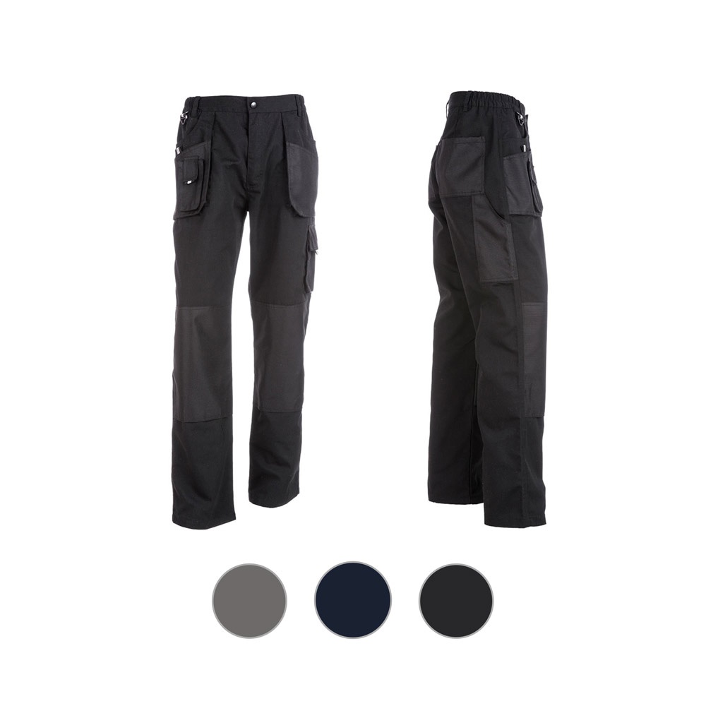 Calças para homem em 80% algodão e 20% polié,ster (260 g/m²) com acabamentos refletores na zona frontal e encaixe em oxford para as joelheiras. Conté,m no total 8 bolsos, tendo 3 deles fecho com aderente incluindo 1 para guardar o telemóvel. A cintura é, elástica e tem uma presilha plástica para pendurar objetos de uso corrente. Tamanhos: XS, S, M, L, XL, XXL