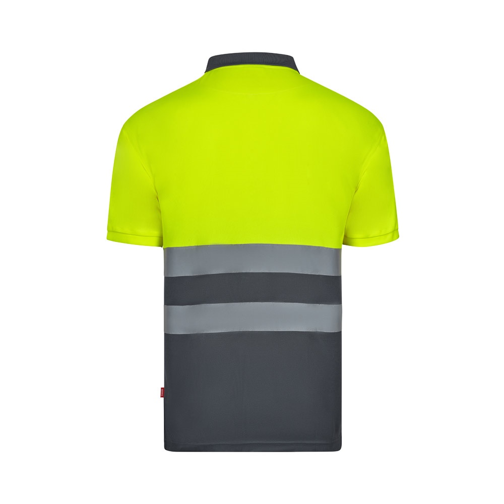 Polo bird-eye (140g/m²) de manga curta, em poliéster (100%). Botões e gola canelada em cor contraste. Faixas refletoras no peito e um bolso no peito. Produto em conformidade com o Reg. EU 2016/425, certificado pela norma EN20471 e de classe Nº 1. Tamanho: S, M, L, XL, 2XL, 3XL