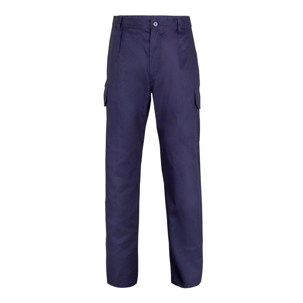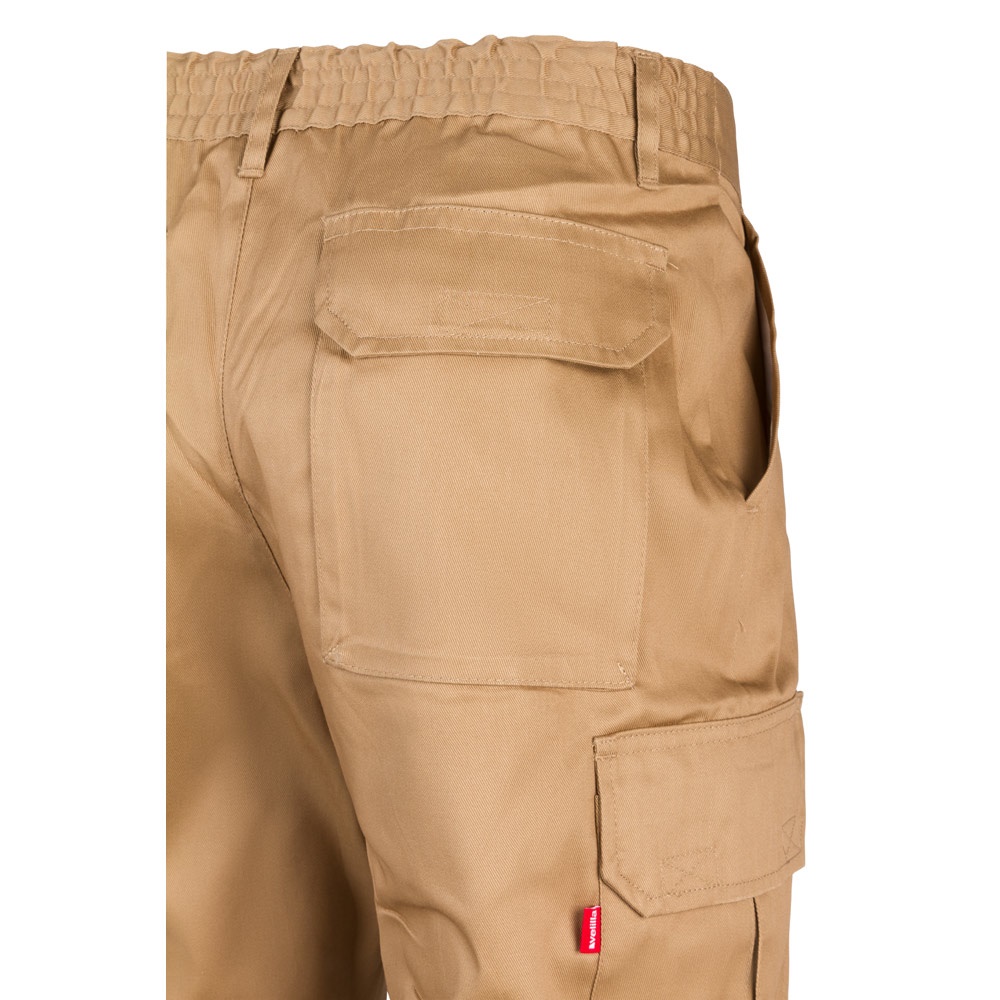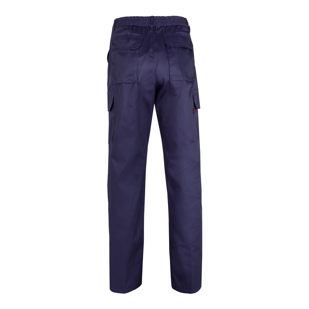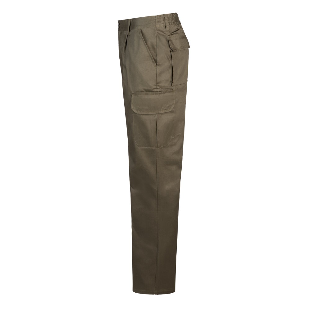 Calças em sarja (200g/m²) multibolsos,em algodão (35%) e poliéster (65%). Com cós elástico, e seis bolsos (2 bolsos franceses, 2 bolsos fole laterais e 2 bolsos fole traseiros). Tamanho: 34, 36, 38, 40, 42, 44, 46, 48, 50, 52, 54, 56, 58, 60, 62, 64