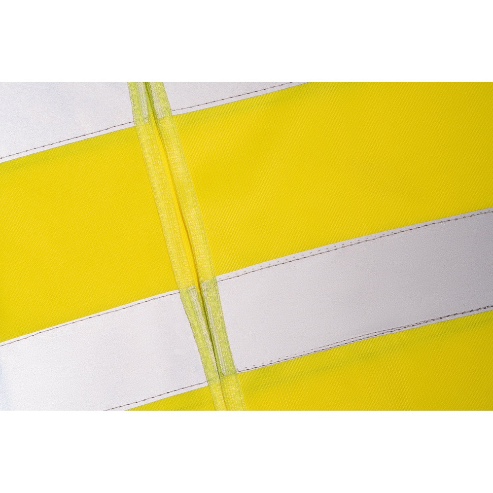 Colete de alta visibilidade em 100% poliéster certificado pela norma EN ISO 20471 classe 2. Colete refletor com 2 bandas refletoras horizontais e abertura frontal com fecho aderente. Tamanho único: 670 x 700 mm